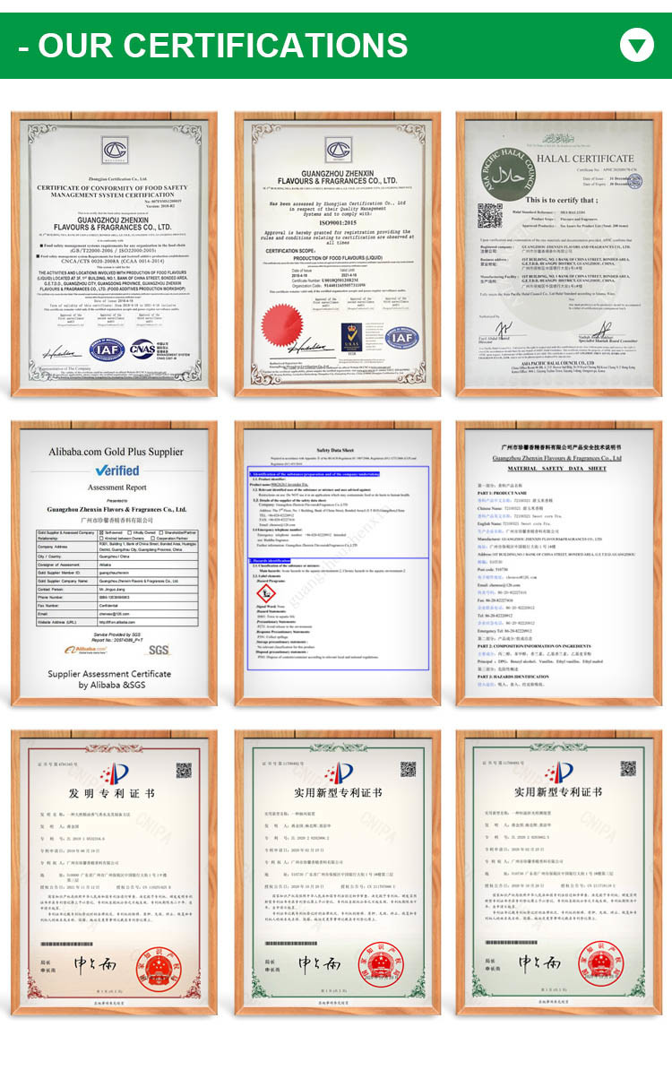 গুয়াংজু ঝেনক্সিন স্বাদ ও সুগন্ধি কোং লিমিটেড 14 বছরেরও বেশি সময় ধরে স্বাদ এবং সুগন্ধি উত্পাদন উপর ফোকাস, আমরা ISO9001, ISO22000, এবং হালাল সার্টিফিকেশন পেয়েছি।আমরা সিওএ, এমএসডিএস, আইএফআরএ এবং অ্যালার্জেন রিপোর্ট সরবরাহ করতে পারি।